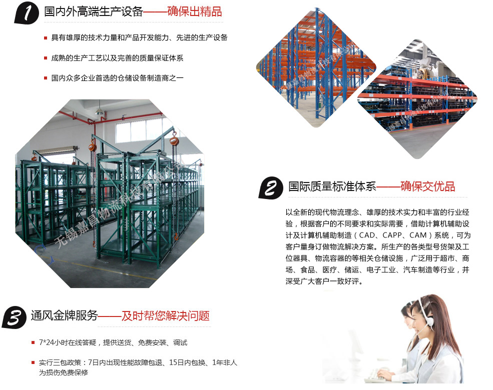 無錫嘉昌倉儲貨架有限公司是國內現代倉儲物流技術開發、設計、生產和安裝的專業廠家,具有雄厚的技術力量和產品開發能力、先進的生產設備、成熟的生產工藝以及完善的質量保證體系。公司始終“以質量求生存,以信譽求發展的”的經營理念,放眼世界,積極引進、吸收國際物流行業先進技術,憑借專業的制作經驗、優秀的產品質量,是國內眾多企業首選的倉儲設備制造商之一。